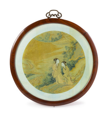 A Chinese Ink and Color on Silk Fan with Hardwood Frame