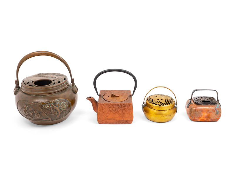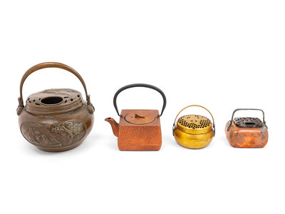 comprising three copper and bronze hand warmers with openwork covers, and one square teapot.