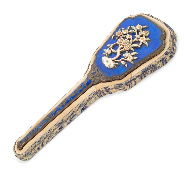 A Chinese Bone Inset Blue Enameled Metal Hand Mirror