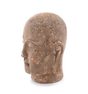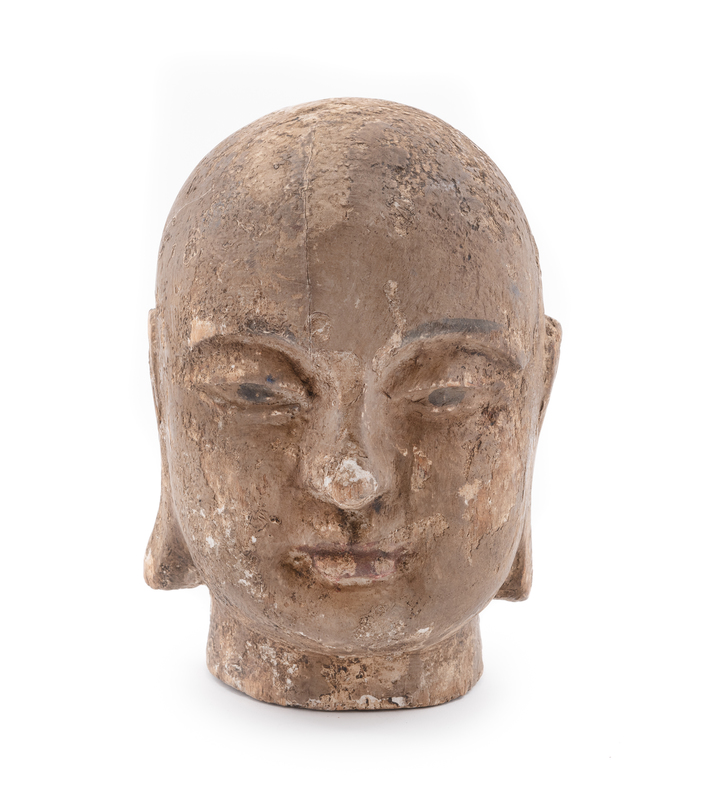the face carved with a pair of almond-shaped eyes underneath arched eyebrows, a tall nose above thick lips, elongated earlobes.