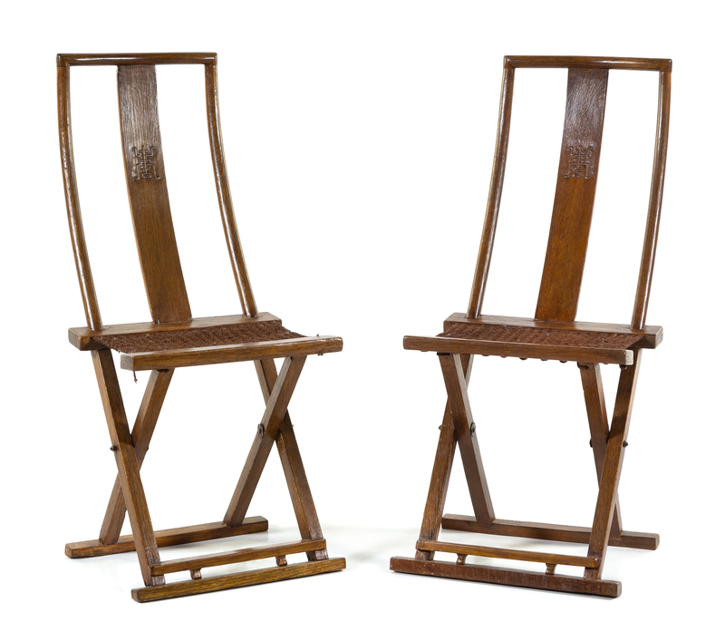 each with a slightly curved top rail surmounting a splat carved with shou character, the X-frame legs raised atop block feet with a folding foot rest.