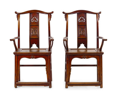 each with a upward curving crest rail supported by a carved backsplat and cylindrical spindrels, from which extend s-shaped armrests, all supported on four legs of square section.