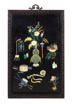 of rectangular form, having jade, malachite, agate, rose quatz and other previous hardstone insets depicting auspicious objects including a flower-filled gourd vase, a bowl full of fruits, a ruyi scepter, two small figures, firework and scholar's objects, all reserved on a black lacquered ground.