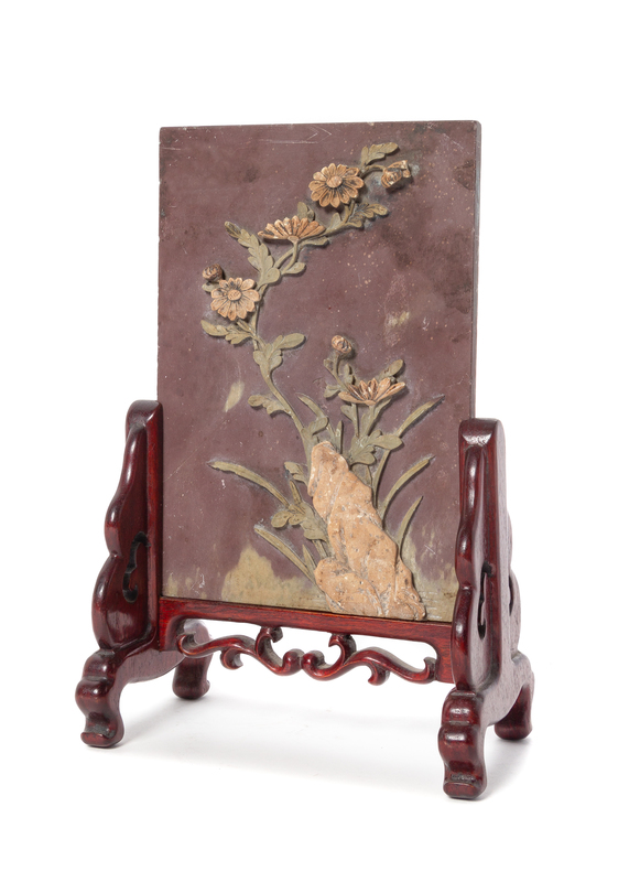 of rectangular form, the front carved in relief with flowering chrysanthemum emerging from rockwork, set in a rosewood stand forming a table screen.