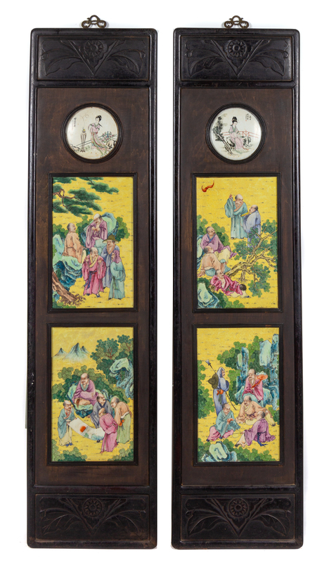 Two Chinese Famille Rose Porcelain Inset Hardwood Wall Panels