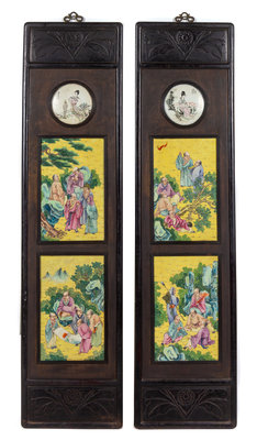 each of rectangular form, inset with three porcelain plaques, one circular example, painted with a lady in a garden, two rectangular examples, decorated with various luohan figures in outdoor settings reserved on a yellow ground.