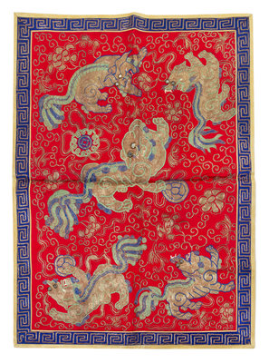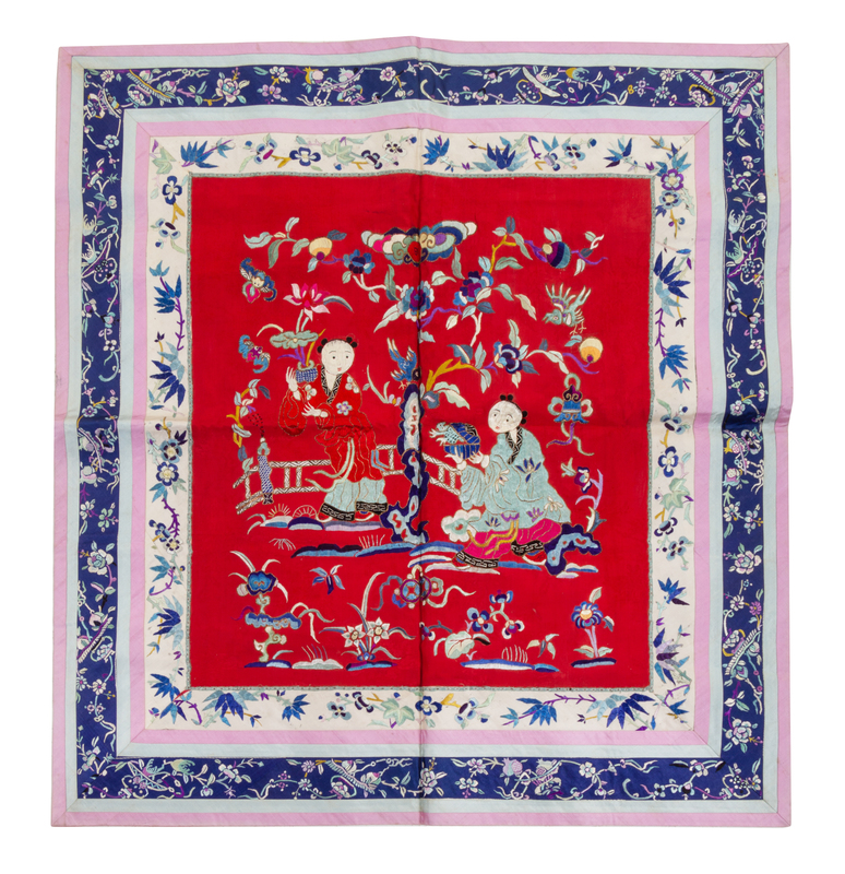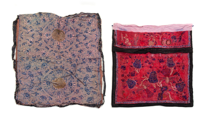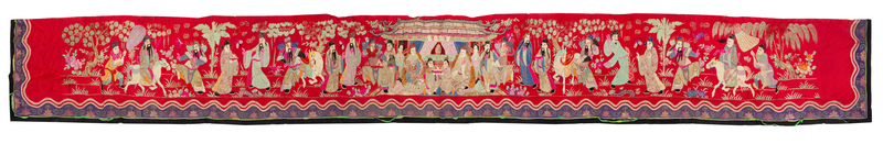 each of rectangular form, embroidered to depict figures and floral scrolls.