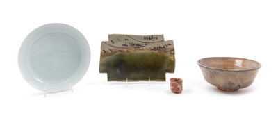 comprising a white glazed bowl, a russet glazed cup, a celadon glazed bowl and a celadon glazed plate.