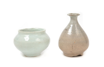 the first a white glazed jar, the second a celadon glazed bottle vase. The jar with a fitted wooden box.