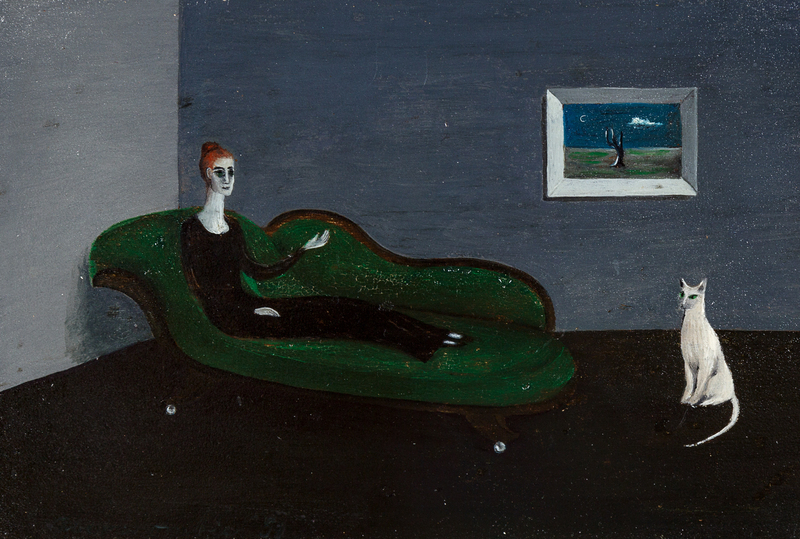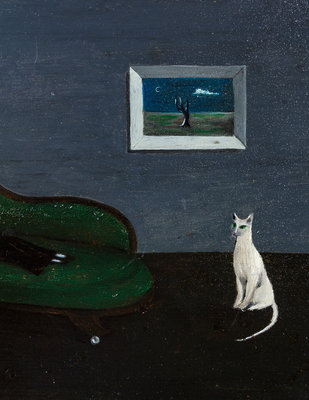 Untitled (Countess Narone on Chaise with White Cat and Lonely Tree Painting)