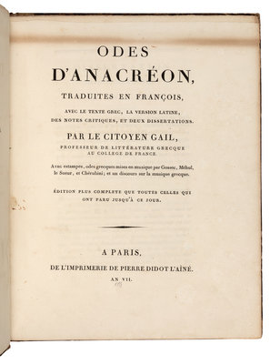 Later edition, preceded by the first edition of 1794, of Anacreon's lyrical poetic work, translated from the Greek by celebrated French Hellenist, Jean-Baptiste Gail. Cohen de Ricci 81.