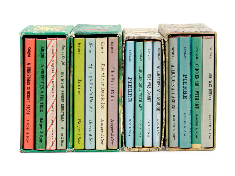 SENDAK, Maurice. [Nutshell Library]. Alligators All Around -- Pierre -- Chicken Soup with Rice -- One was Johnny. 1962. Small 16mo. All in original lavender cloth; original printed dust jackets; original slipcase. [With:] Another edition. London: Collins, 1964.