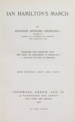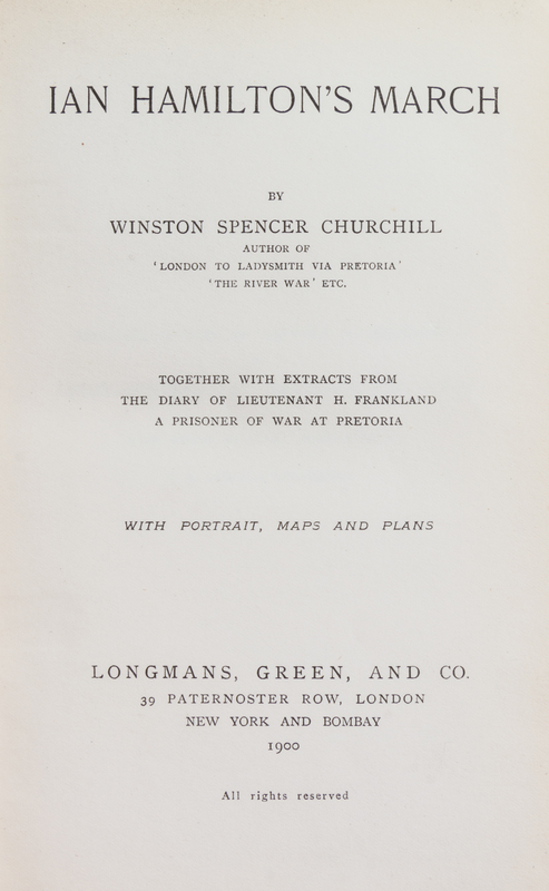CHURCHILL, Winston Spencer (1874-1965). Ian Hamilton's March. New York and Bombay: Longmans, Green, and Co., 1900.