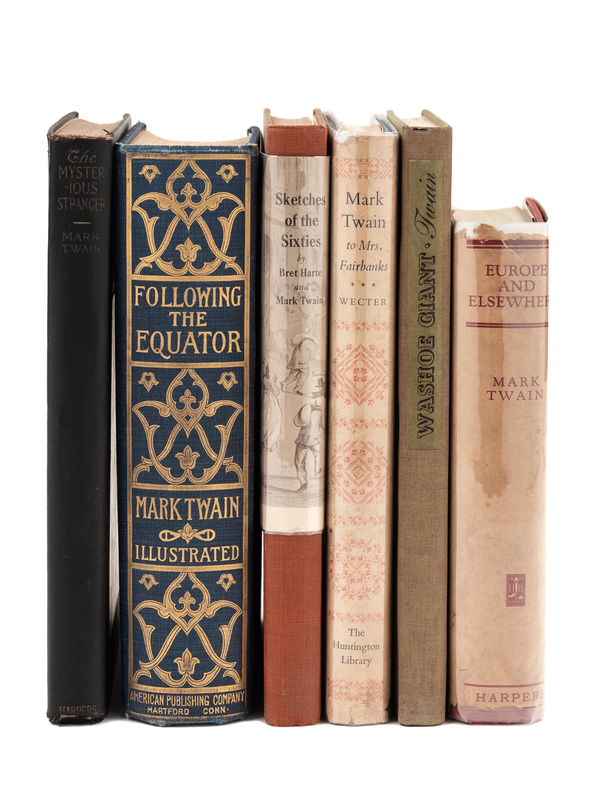 Following the Equator. Hartford, CT: The American Publishing Company, 1897. FIRST TRADE EDITION. BAL 3451. -- The Mysterious Stranger. New York and London: Harper & Brothers Publishers, 1916. N. C. Wyeth, illustrator. FIRST EDITION. BAL 3520. -- Europe and Elsewhere. New York and London: Harper & Brothers, Publishers, 1923. Original publisher’s dust jacket (some minor chipping). FIRST EDITION. BAL 3536. -- TWAIN & HART, Bret. Sketches of the Sixties. San Francisco: John Howell, 1926. Original publisher’s dust jacket (portion only). FIRST TRADE EDITION. BAL 3539. -- The Washoe Giant in San Francisco. San Francisco: George Fields, 1938. FIRST EDITION. BAL 3559. Prospectus laid in. -- To Mrs. Fairbanks. San Marino, CA: Huntington Library, 1949. Dixon Wecter, editor. FIRST EDITION. BAL 3578. Original publisher’s dust jacket (some minor chipping and soiling). -- Together, 6 works in 6 volumes, ALL FIRST EDITIONS, all in original publisher's cloth bindings, condition generally fine.