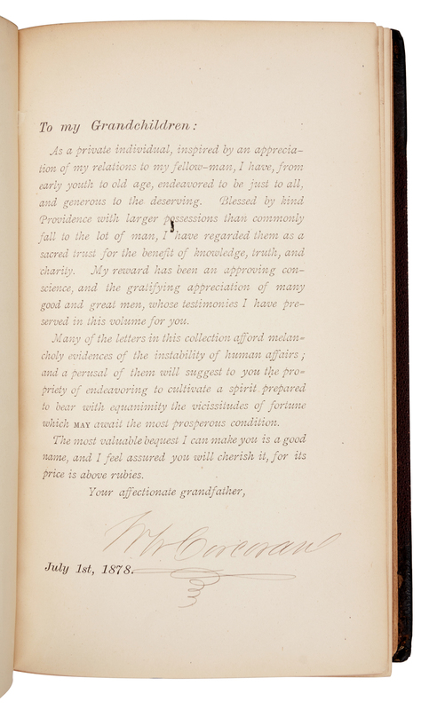 FIRST EDITION, SIGNED BY CORCORAN, founder of the Corcoran Gallery of Art in Washington, D. C., on the dedication page. In his introduction to his grandchildren, he notes: "The most valuable bequest I can make you is a good name, and I feel assured you will cherish it, for its price is above rubies."