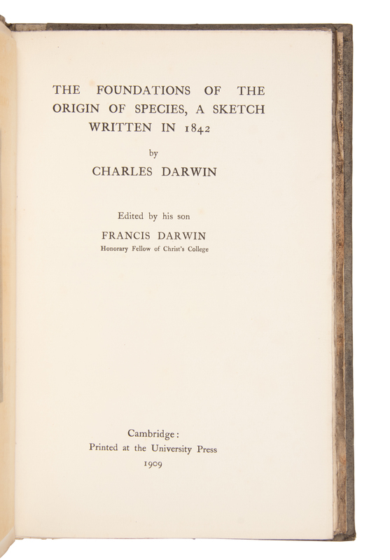 DARWIN, Charles (1809-1882). The Foundations of the Origin of Species, a Sketch written in 1842. Francis Darwin, editor. Cambridge: Cambridge University Press, 1909.