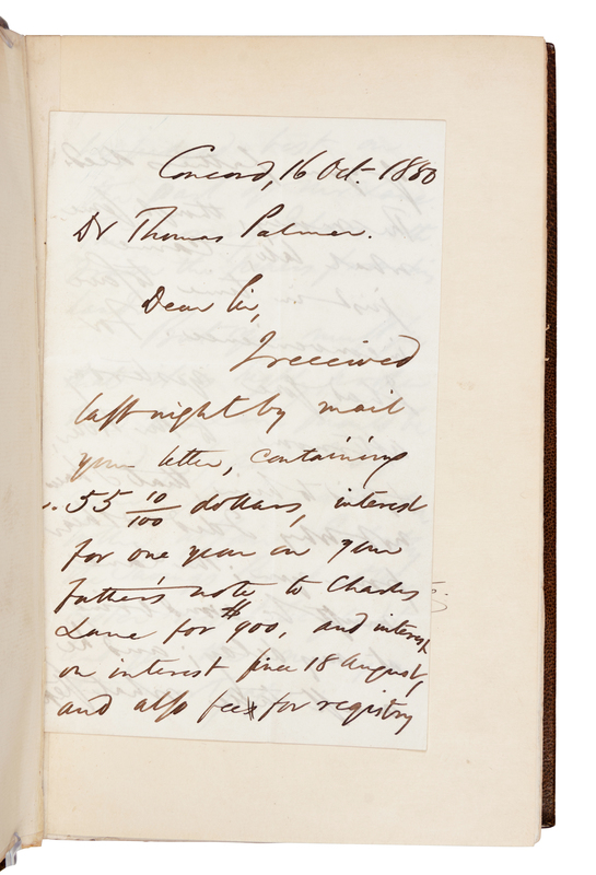 [Tipped in to volume one:] EMERSON. Autograph letter signed ("R. W. Emerson"), to Dr. Thomas Palmer. Concord New Hampshire, 16 October 1880. Emerson thanks Palmer for sending him fifty-five dollars toward payment on a loan made by Charles Lane to Palmer's father.