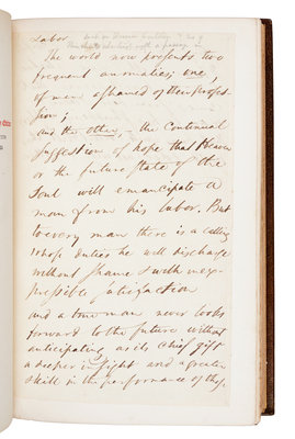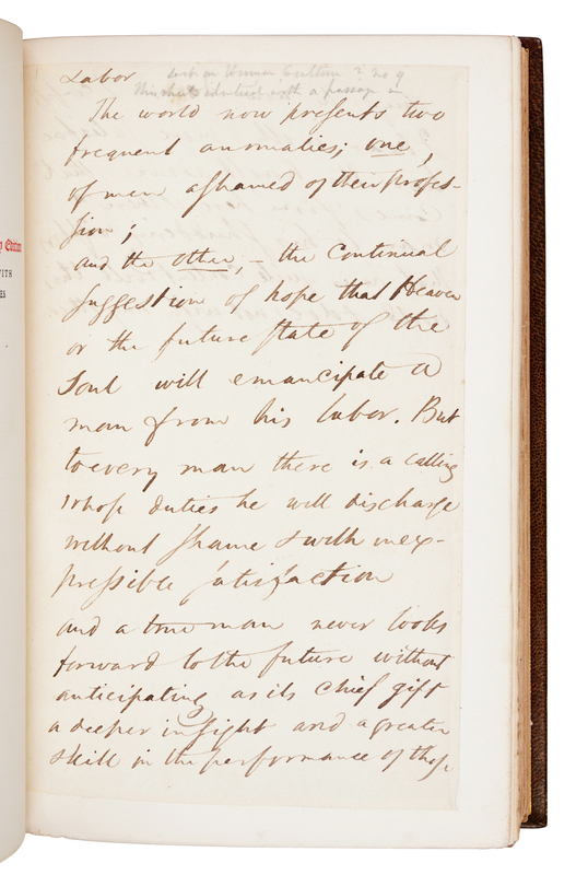 [Bound into volume one:] EMERSON. 1 1/2 page holograph manuscript, comprising 26 lines from his early lecture, "The Doctrine of the Hands" (ca 1837-1838).