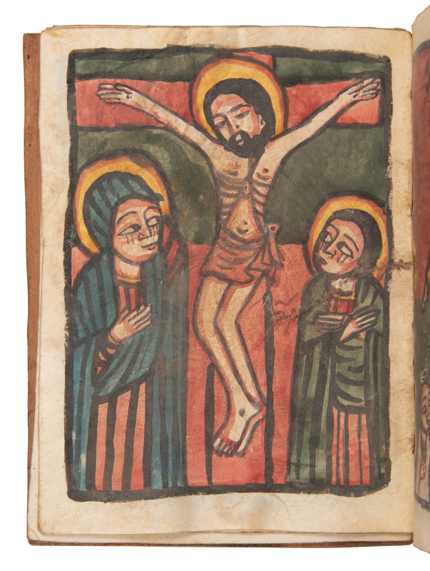 182 leaves, on vellum, c.145 x 105mm. Written in a small Ethiopic Ge’ez script in two columns, in black ink with some words or letters in red. With 8 full-page hand-painted miniatures in colors on 5 leaves (7 preceding text at beginning, one at end). (Several leaves with stitch repairs crossing image on 6 of the miniatures, several vellum hole/flaws affecting 3 miniatures and text, some finger-soiling. Stitched quires bound within original thick polished wooden board covers (some pencil interlace designs drawn on first and final blanks).