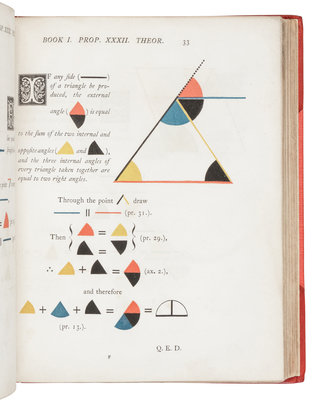 BYRNE'S REMARKABLE RENDERING OF EUCLIDEAN GEOMETRY USING FOUR-COLOR PRINTING. The stark use of primary colors was envisaged by Byrne as a teaching aid. "Each proposition is set in Caslon italic, with a four line initial engraved on wood by Mary Byfield: the rest of the page is a unique riot of red, yellow and blue ... attaining a verve not seen again on book pages till the days of Dufy, Matisse and Derain" (McLean). Byrne's depiction of Pythagoras is a classic, with the squares being visually interpreted so in vivid blocks of colour. In a technical tour-de-force, Whittingham skillfully aligned the different color blocks for printing to produce "One of the oddest and most beautiful books of the whole century" (McLean). Ing, Charles, Whittingham Printer 46; Keynes, Pickering, pp. 37, 65; McLean, Victorian Book Design, p.70, illustration facing p. 53.