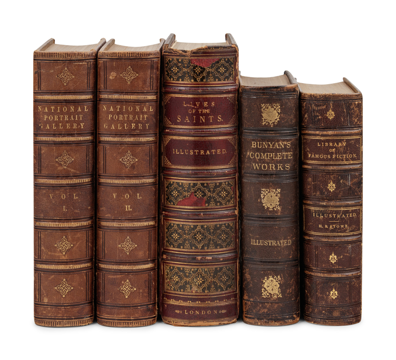 DUYCKINCK, Evert A. National Portrait Gallery of Eminent Americans. New York: Johnson, Fry & Company, ca 1862. CHAPPEL, Alonzo, illustrator. 2 volumes. -- HOTTEN, John Camden (publisher). Lives of the Saints. London: John Camden Hotten, 1869. -- BUNYAN, John. The Complete Works of John Bunyan. Philadelphia: Bradley, Garretson & Co., 1872. “Illustrated Edition”. -- STOWE, Harriet Beecher. A Library of Famous Fiction. New York: J. B. Ford and Company, 1873. -- Together, 4 works in 5 volumes, similarly bound in late 19th-century publisher's brown morocco gilt bindings, condition generally good.
