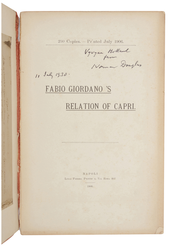 [HOLLAND, Vyvyan, his copy]. DOUGLAS, Norman (1868-1952). Fabio Giordano's Relation of Capri. Naples: Luigi Pierro, 1906.