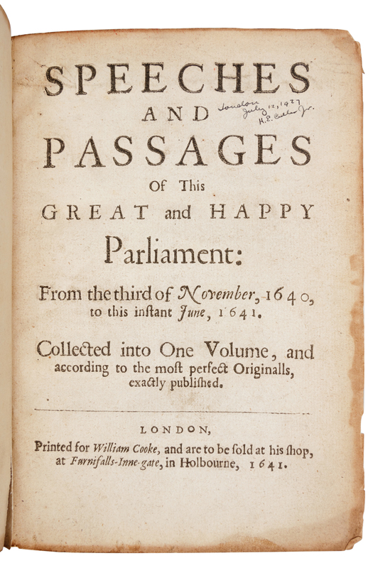 [LAW - PARLIAMENT]. Speeches and Passages of this Great and Happy Parliament. London: for William Cooke, 1641.