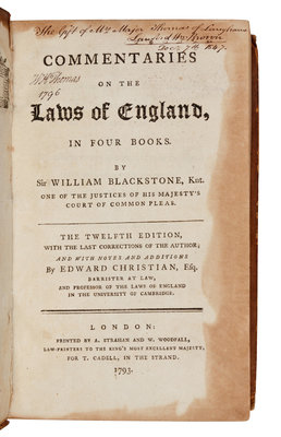 [LAW]. BLACKSTONE, William, Sir, (1723-1780). Commentaries on the Laws of England with the Last Corrections of the Author; and with Notes and Additions by Edward Christian Esq. London: A. Strahan and W. Woodfall, 1793-1795.