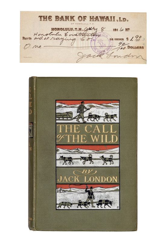 [Laid in:] LONDON, Jack. Printed check, signed and accomplished in holograph, 8 July 1916. Drawn on the Bank of Hawaii of Honolulu, T. H. for $1.90 payable to Honolulu Construction and Draying Co. One page, oblong 12mo (small puncture not affecting signature).