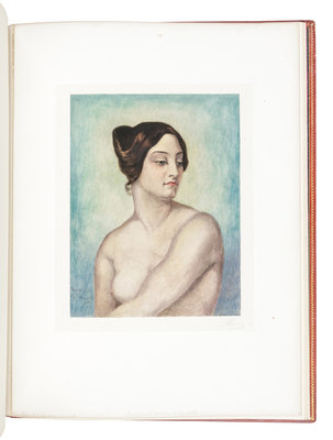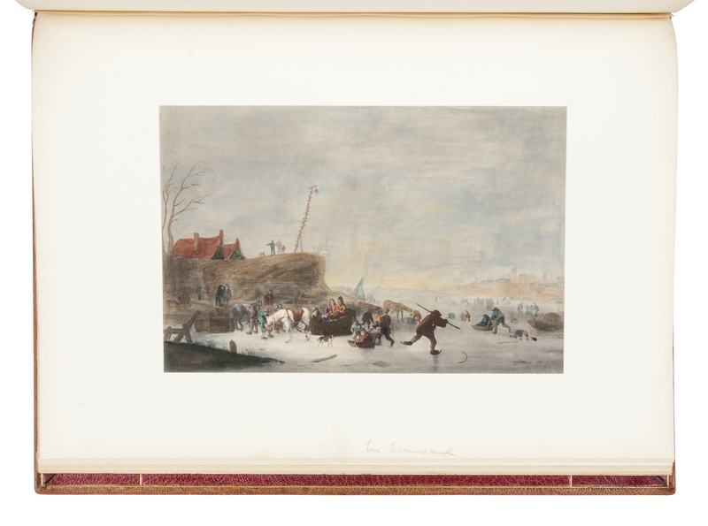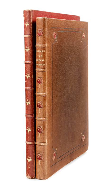 Small folio. A collection of 22 engraved plates after Ostade with modern hand-coloring. Tipped into 20th-century green morocco album gilt, maroon morocco doublures gilt, ivory watered silk endpapers, stamp-signed by The French Binders, Garden City, NY (spine sunned, some light rubbing).