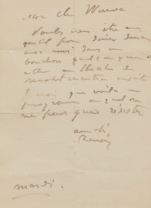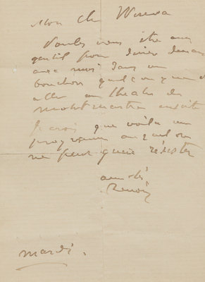 RENOIR, Pierre Auguste (1841-1919). Autograph letter signed ("Renoir"), in French, to "Mon Ch Wireva?". N.p., n.d.