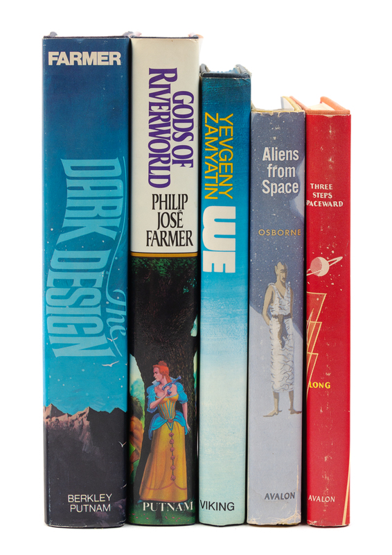 FARMER, Philip Jose. The Dark Design. New York: Berkley Publishing Corporation, distributed by G.P. Putnam's Sons, 1977. -- Gods of Riverworld. New York: G.P. Putnam's Sons, 1983. -- LONG, Frank B. Three Steps Spaceward. New York: Avalon Books, 1963. -- [SILVERBERG, Robert] OSBORNE, David. Aliens from Space. New York: Avalon Books, 1958. SIGNED BY THE AUTHOR AS DAVID OSBORNE AND ROBERT SILVERBERG. -- ZAMYATIN, Yevgeny and Mirra GINSBURG (translator). We. New York: The Viking Press, 1972. FIRST AMERICAN EDITION. PUBLISHER'S REVIEW COPY with The Viking Press review slip laid in. -- Together 5 works in 5 volumes, 8vo, FIRST EDITIONS, publisher's cloth, dust jackets, condition generally good.