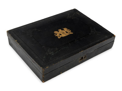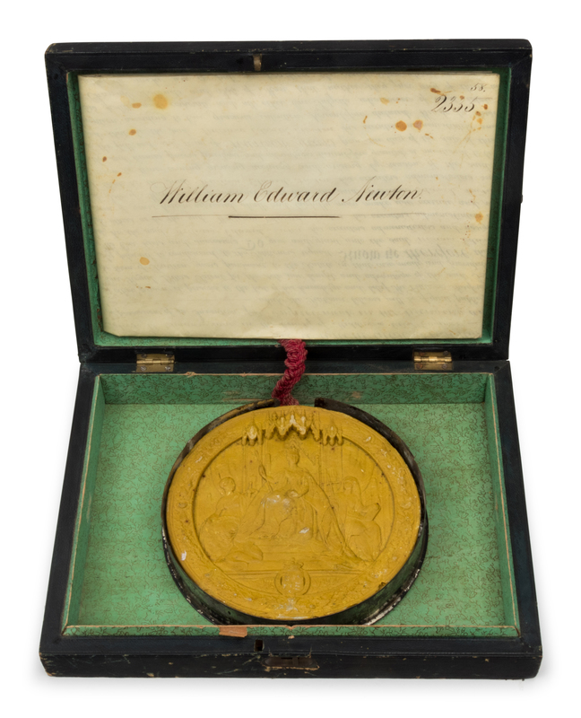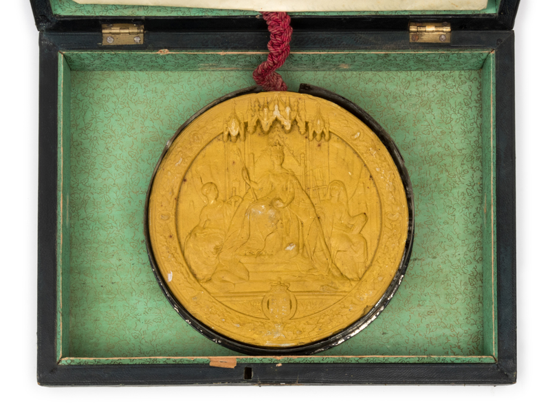 2 pages, 532 x 765 or smaller, on parchment, margins ruled in red, with an impression of THE GREAT SEAL OF VICTORIA IN YELLOW WAX (diameter: 157 mm, depicting the robed Queen on her throne), pendant on maroon twine, in original tin skippet (label pasted to one side), within original leather presentation box. A PATENT granted William Edward Newton for "improvements in the hanging and arranging of cylindrical, conical, or spiral steel railroad springs for Railway carriages."