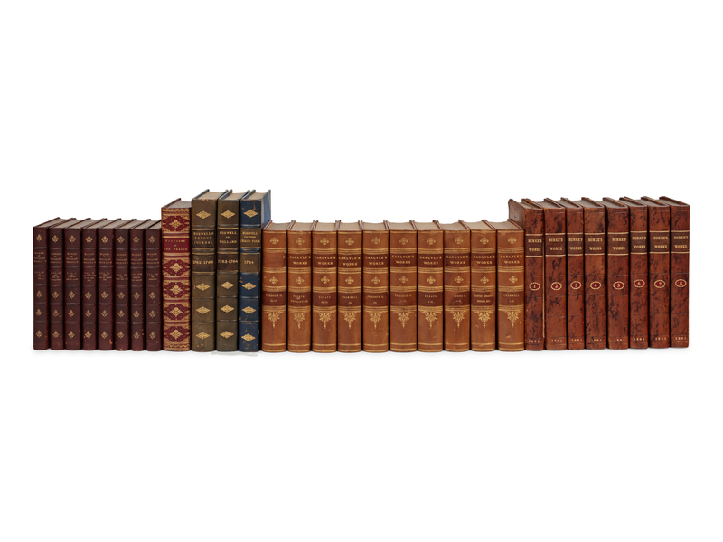 JOHNSON, Samuel. Works. London: for J. Buckland and others, 1787. 11 volumes (of 13). -- BURKE, Edmund. Works. London: for F. and C. Rivington, 1801. -- JANIN, Jules Gabriel, et al. Pictures of the French: A Series of Literary and Graphic Delineations of French Character. London: William S. Orr and Co., 1840. -- JERROLD, Douglas. The Writings of Douglas Jerrold. London: Bradbury and Evans, 1851-1854. 8 volumes. -- BOSWELL, James. The Yale Editions of the Private Papers of James Boswell. Melbourne, London, Toronto: William Heinemann Ltd., 1950-1953. 3 (of 4) volumes. -- CARLYLE, Thomas. Works. New York: International Book Company, n.d. [but ca 1869]. 10 volumes. -- All in half or full leather gilt (chipping to a few lettering-pieces, one set rebacked, one cover detached).