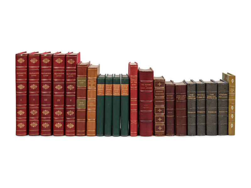 MEREDITH, George. Rhoda Fleming. London: Chapman and Hall, 1886. -- HOMER. The Odyssey. Cambridge, MA: The Riverside Press, 1929. -- PLUTARCH. The Lives of the Noble Grecians and Romanes Compared Together by that Grave Learned Philosopher and Historiographer Plutarke of Chæronea. London: The Nonesuch Press, 1930. 5 volumes. -- MILTON, John. Paradise Lost. New York: The Heritage Press, 1940. -- TENNYSON, Alfred, Lord. Idylls of the Kind. New York: The Limited Editions Club, 1952. -- And 6 others. All in modern full or half leather gilt, condition generally fine. Complete list available on request.