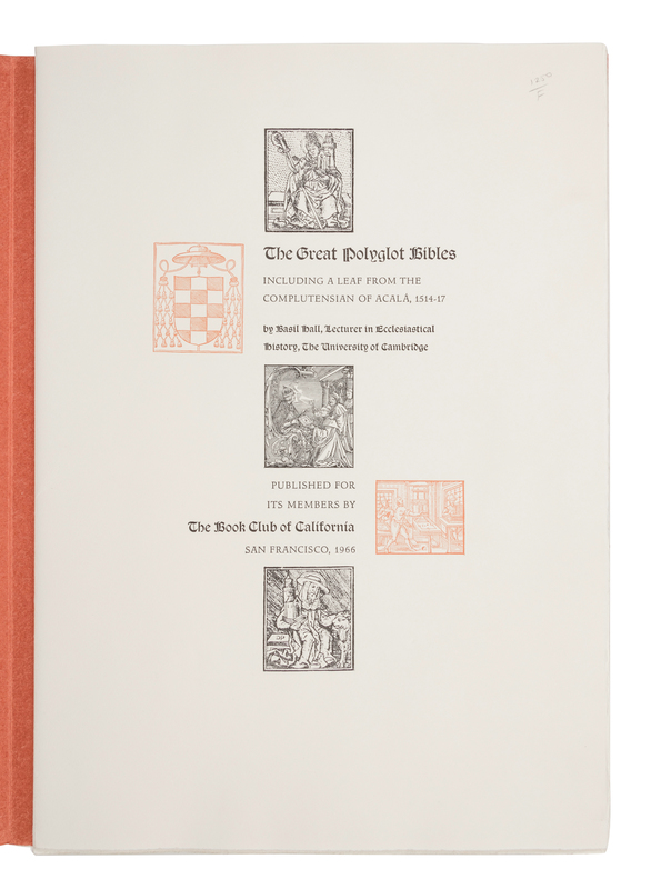 [BOOK CLUB OF CALIFORNIA]. HALL, Basil. The Great Polyglot Bibles: Including a Leaf from the Complutensian of Acalá, 1514-17. San Francisco: the Book Club of California, 1966.