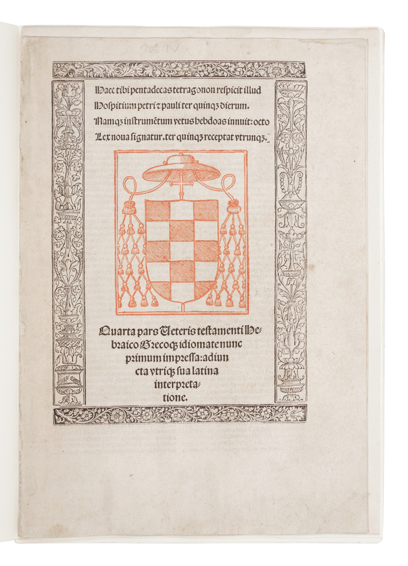 LIMITED EDITION, one of 400 unnumbered copies, printed by the Allen Press. The 7 leaves from the Complutensian of Acalá comprise 5 text leaves, and 2 leaves including title and prologue to Part IV, with the arms of Cardinal Jimenez printed in red within a decorative woodcut border. Allen Press Bibliography 30.