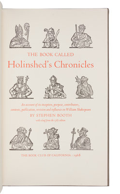 [BOOK CLUB OF CALIFORNIA]. BOOTH, Stephen. The Book Called Holinshed's Chronicles... San Francisco: The Book Club of California, 1968.