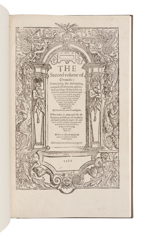 Folio. Title-page from vol. II of the 1587 edition of Holinshed's Chronicles tipped in; title-page printed in red and black, numerous illustrations. Original cream linen-backed decorative paper-covered boards, printed paper label on spine (small strip of upper cover slightly sunned, otherwise fine).