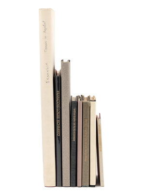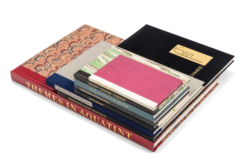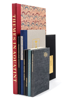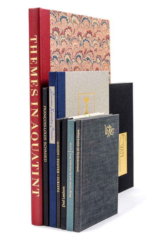 JOHNSON, Cecil and James. A Printer's Garland. 1935. 12mo. Original vellum-backed boards. One of 300 copies. -- KAINEN, Jacob. George Clymer and the Columbian Press. 1950. Original cloth; original glassine. One of 350 copies. -- RITCHIE, Ward. Frederic Goudy, Joseph Foster, and the Press at Scripps College. 1978. Original cloth-backed boards; original plain lavender dust jacket. One of 550 copies. Original prospectus laid in. -- DREYFUS, John. William Caxton and his Quincentenary. 1976. Original cloth. One of 400 copies. Errata tipped to limitation page. Original prospectus laid in. -- FRANKLIN, Colin. Themes in Aquatint. 1978. Original cloth-backed boards; original plain dust jacket. One of 500 copies. Original prospectus laid in. -- RITCHIE, Ward. Paul Landacre. 1982. Original cloth-backed boards; original dust jacket. One of 650 copies. -- RITCHIE, Ward. Art Deco. The Books of François-Louis Schmied Artist/Engraver/Printer. 1987. Original cloth; glassine. Original prospectus laid in. -- TEISER, Ruth. Lawton Kennedy, Printer. 1988. Original cloth-backed boards; original dust jacket. One of 450 copies.