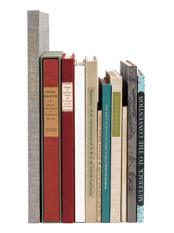 REEDY, William Marion. The City That has Fallen. 1933. 12mo. Original cloth-backed boards. One of 350 copies. -- KING, Clarence. The Helmet of Mambrino. 1938. 12mo. Original vellum-backed boards. One of 350 copies. -- BROWNE, J. Ross. Muleback to the Convention. 1950. 8vo. Original boards. One of 400 copies. -- HART, James D., editor. My First Publication. 1961. 8vo. Original cloth-backed boards. One of 475 copies. Original prospectus laid in. -- FRÉMONT, John C. Geographical Memoir. 1964. 8vo. Original boards. One of 425 copies. -- Yo Semite 1878. Adventures of N & C. 1964. 8vo. Original cloth-backed boards. One of 450 copies. -- JOHNSON, Kenneth M. The Sting of the Wasp. 1967. Folio. Original cloth. One of 450 copies. -- LEWIS, Oscar. The First 75 Years. 1987. 8vo. Original cloth-backed boards. One of 1200 copies. -- DAVISON, Richard Allan. Charles & Kathleen Norris The Courtship Year. 1993. 4to. Original cloth. One of 400 copies. -- LEWIS, Oscar. A Widely Cast Net. 1996. 8vo. Original cloth-backed boards; original plain dust jacket. One of 400 copies. -- Dear Master. Letters of George Sterling to Ambrose Bierce 1900-1912. 2002. 4to. Original cloth-backed boards; original slipcase. One of 350 copies.