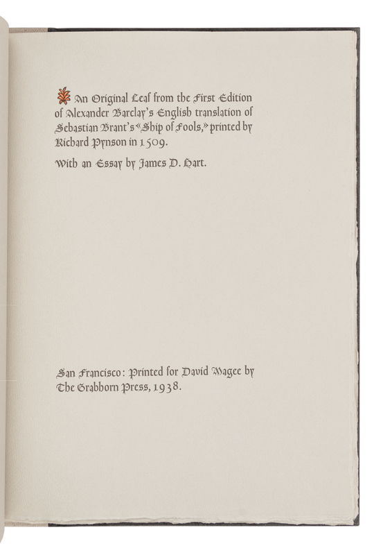 [GRABHORN PRINTING]. [BARCLAY, Alexander]. [MAGEE, David]. An Original Leaf from the First Edition of Alexander Barclay's English translation of Sebastian Brant's Ship of Fools. San Francisco: The Grabhorn Press for David Magee, 1938.