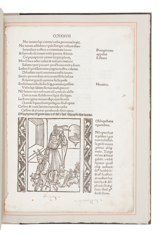 LIMITED EDITION, one of 115 unnumbered copies with an original leaf bearing a woodcut of a total edition of 160. Among the passengers in Brant's famous allegory is the Book-Collector: "So in lyke wyse of bokys I have store / But few I rede and fewer understande / I followe not theyr doctryne nor theyr lore / It is enoughe to bere a boke in hande." Original prospectus laid in. GB 300.