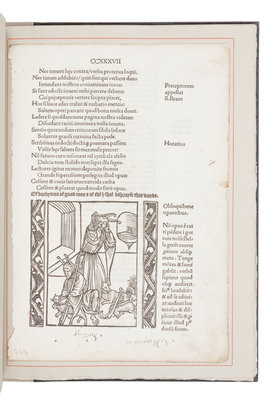 Folio. Original leaf from the first edition of Brant’s Ship of Fools (1509) with a wood-cut miniature tipped in; woodcut illustrations printed in colors in margins. Original cream linen-backed decorative paper-covered boards, printed paper label to spine, uncut.