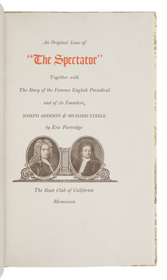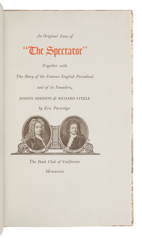 [GRABHORN PRINTING]. An Original Issue of "The Spectator" Together with The Story of the Famous English periodical and of its Founders, Joseph Addison & Richard Steele. San Francisco: The Grabhorn Press for the Book Club of California, 1939.
