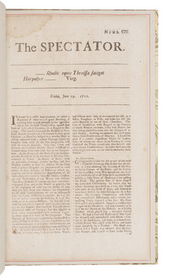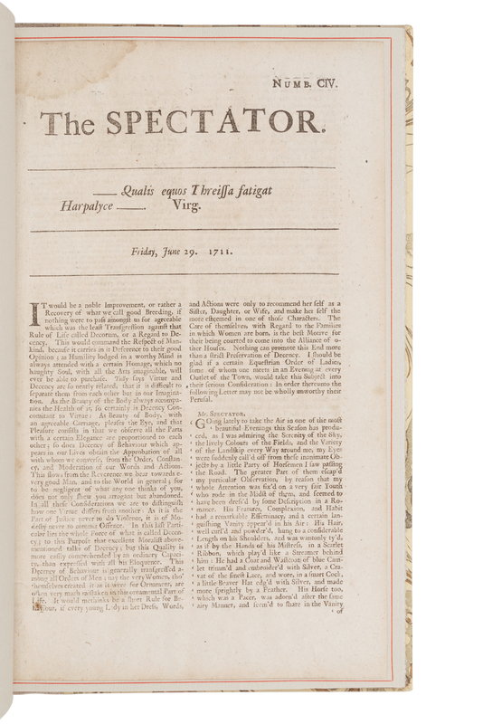 4to. One leaf of The Spectator tipped in for Friday, June 29, 1711 (short tear lower left); title-page printed in red and black.