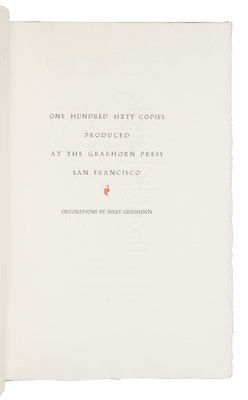 Folio. Illustrations by Mary Grabhorn; text printed in red and black. Original tan linen-backed patterned paper-covered boards, red morocco lettering-piece gilt, uncut.