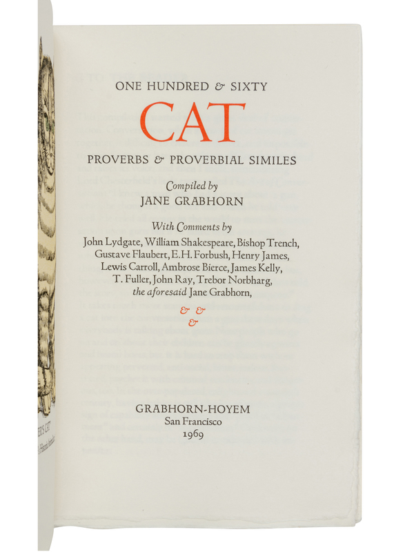 [GRABHORN PRINTING]. GRABHORN, Jane B., compiler. One Hundred & Sixty Cat Proverbs & Proverbial Similes. San Francisco: Grabhorn-Hoyem, 1969.
