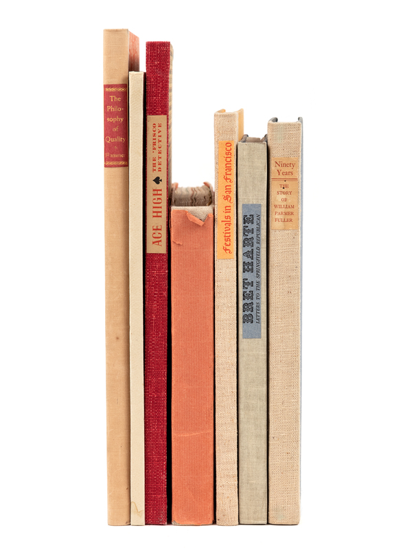 Ninety Years. The Story of William Parmer Fuller. San Francisco: The Grabhorn Press for W. P. Fuller & Co., 1939. 8vo. Original cloth-backed boards. -- Festivals in San Francisco. Stanford, CA: The Grabhorn Press for James Ladd Delkin, 1939. 8vo. Original cloth-backed boards. One of 1,000 copies. Original prospectus laid in. -- AUSTIN, Leonard. Around the World in San Francisco. Stanford: The Grabhorn Press for James Ladd Delkin, 1940. Oblong 4to. Original cloth-backed boards; original printed dust jacket . One of 500 copies. Original prospectus and order blank laid on. -- [A Tribute to Albert Bender]. 1941. 4to. Original boards. One of 300 copies. -- FLAMMER, Charles. The Philosophy of Quality. A Way of Life. 1947. 4to. Original cloth-backed boards. -- TRIPP, C. E. Ace High. The 'Frisco Detective. San Francisco: The Grabhorn Press for The Book Club of California, 1948. 4to. Original cloth-backed boards. One of 500 copies. -- HARTE, Bret. San Francisco in 1866. San Francisco: The Grabhorn Press for The Book Club of California, 1951. 8vo. Original cloth-backed boards. One of 400 copies.