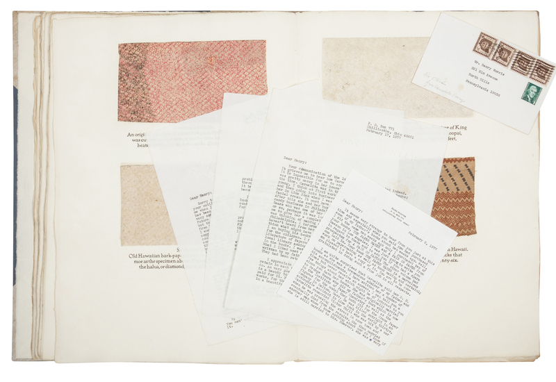 Folio. Frontispiece after a print of the Mountain House, numerous tipped-in samples of bark paper, plain and decorated, tipped-in photographs, illustrations. Loose as issued in half cloth portfolio, printed paper label, cloth ties. Provenance: Carmelita Gomez (correspondence laid in, see below); Henry Morris, publisher, Bird & Bull Press (correspondence laid in, see below).